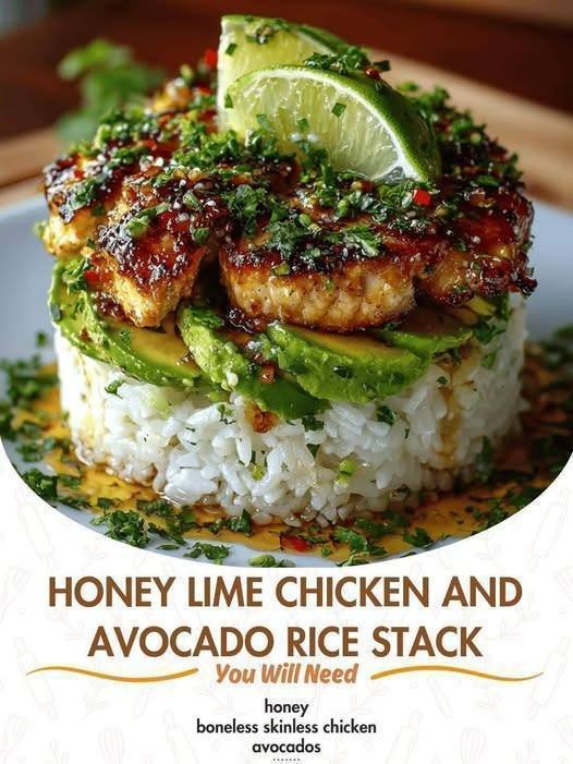 The Honey Lime Chicken and Avocado Rice Stack is a brilliant meal that brings together the bright flavors of the tropics with the comforting texture of a hearty home cooked dinner. This recipe is all about creating layers of flavor and texture that work together in perfect harmony to satisfy your hunger and your taste buds at the same time. At its heart you have tender pieces of chicken breast that have been marinated in a sweet and tangy glaze made from natural honey and fresh lime juice. Below the chicken sits a beautiful layer of creamy mashed avocado which adds a rich and buttery feel to every single bite you take. The foundation of the whole dish is a pile of fluffy white rice that has been seasoned with cilantro and more lime to keep the theme going from top to bottom. It is a dish that looks like it belongs in a high end restaurant because of the way it is stacked tall on the plate but it is actually very simple to put together in your own kitchen. You do not need any special tools other than a simple round container or a measuring cup to help you shape the layers into a beautiful tower of food.