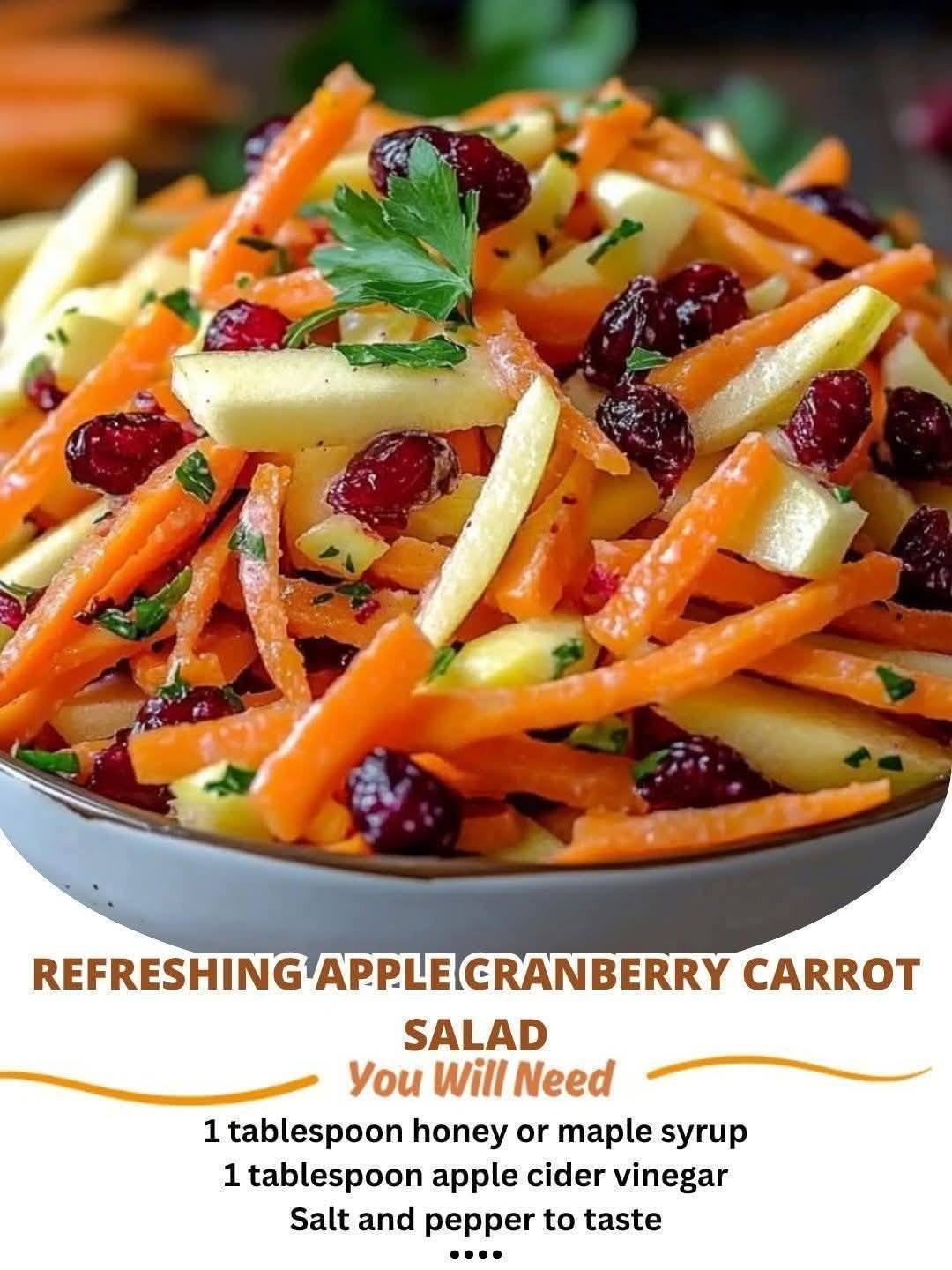 The refreshing apple cranberry carrot salad is a bright and colorful dish that brings together the crisp crunch of fresh garden vegetables with the natural sweetness of orchard fruits. This recipe is all about creating a harmony of textures and flavors that make eating healthy feel like a real treat for your taste buds and your body. You will learn how to shred fresh carrots and slice sweet apples to create a base that is both juicy and firm at the same time which is very satisfying to chew. The addition of dried cranberries adds a chewy element that provides a little burst of tartness in every single forkful of the salad. When you mix these ingredients with a simple homemade dressing you get a side dish that is much more exciting than a regular green leaf salad that you might find at a fast food place. This specific recipe is designed to be very easy for anyone to master even if you are just starting your journey in the kitchen because it requires no cooking over a hot stove or oven. It is a raw food masterpiece that focuses on the quality of the produce and the balance of the ingredients to deliver a high quality dining experience right in your own home. You will love how the vibrant orange of the carrots looks next to the deep red of the cranberries and the bright white of the apple slices on your plate.