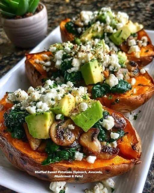 Stuffed sweet potatoes are a wonderful and hearty meal that brings together the natural sweetness of roasted root vegetables with a savory mix of fresh greens and creamy toppings. This recipe is all about creating a balanced bowl of food where the potato acts as a natural edible container for a delicious filling made of sautéed spinach and earthy mushrooms. When you bake a sweet potato until it is soft and caramelized on the inside it becomes the perfect base for adding different textures like the smoothness of ripe avocado and the salty crumbly bite of feta cheese. Many people enjoy this dish because it looks very impressive on a dinner plate but it is actually one of the simplest things you can cook in your own kitchen with very little effort. It is a colorful meal that celebrates fresh produce and shows how simple ingredients can turn into a gourmet feast when they are combined with care and a bit of heat. You do not need any fancy kitchen tools to get this right because the oven does most of the hard work for you while you prepare the quick and tasty stuffing on the stove. This dish is a great way to explore the world of plant based eating without feeling like you are missing out on any flavor or satisfaction because it is very filling and rich.