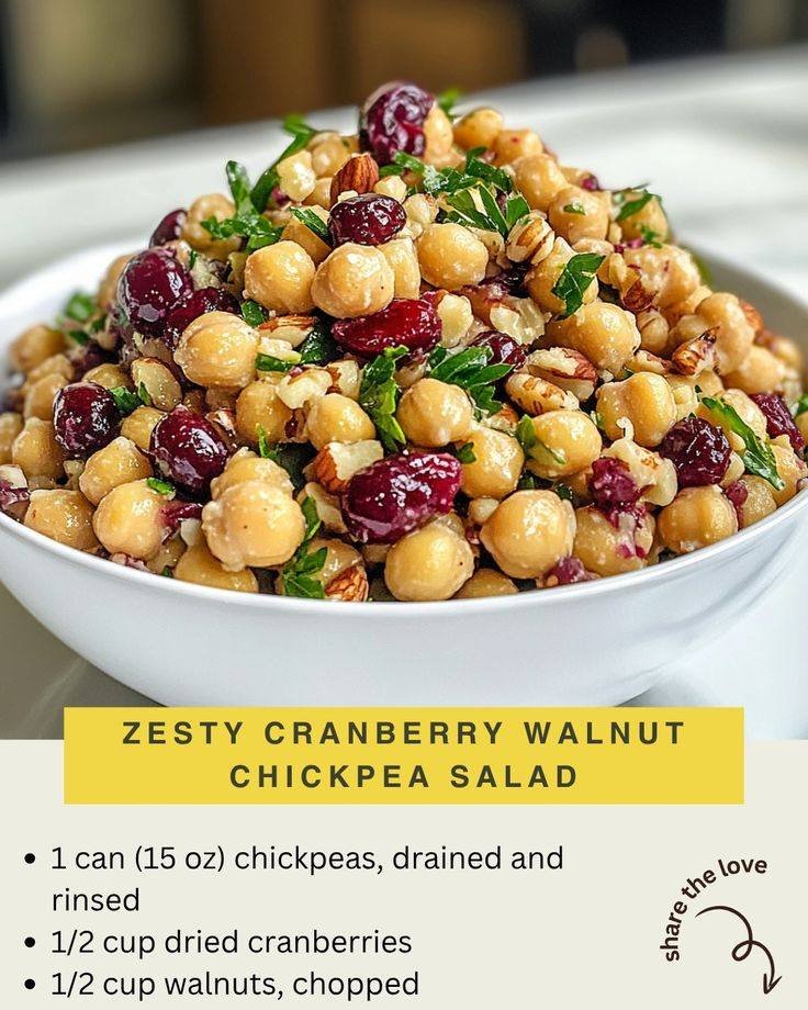 The Zesty Cranberry Walnut Chickpea Salad is a vibrant and refreshing dish that brings together a wonderful mix of textures and flavors in a single bowl. This recipe is all about combining simple whole foods to create a meal that is both filling and incredibly healthy for your body. At its core this salad uses chickpeas as a sturdy base which provides a satisfying bite and plenty of plant based protein. The addition of dried cranberries adds a lovely sweetness while the walnuts provide a necessary crunch that makes every mouthful interesting. Because it does not require any cooking this recipe is a favorite for people who want a quick meal without turning on the stove. It is a modern take on a classic chicken salad but it uses legumes instead to keep things light and fresh. You can serve it on its own or use it as a filling for wraps and sandwiches depending on what you feel like eating. It is truly a versatile dish that fits perfectly into a busy lifestyle while still feeling like a gourmet treat from a fancy cafe.